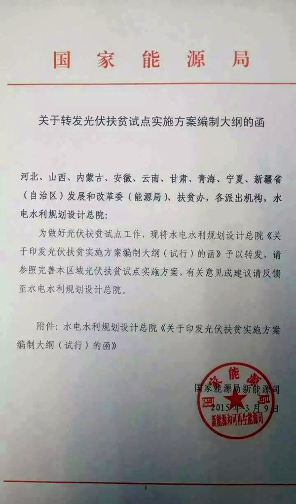 圖為:國家能源局關于轉發光伏扶貧(pin)試點實施方案編(bian)制大綱(gang)的函