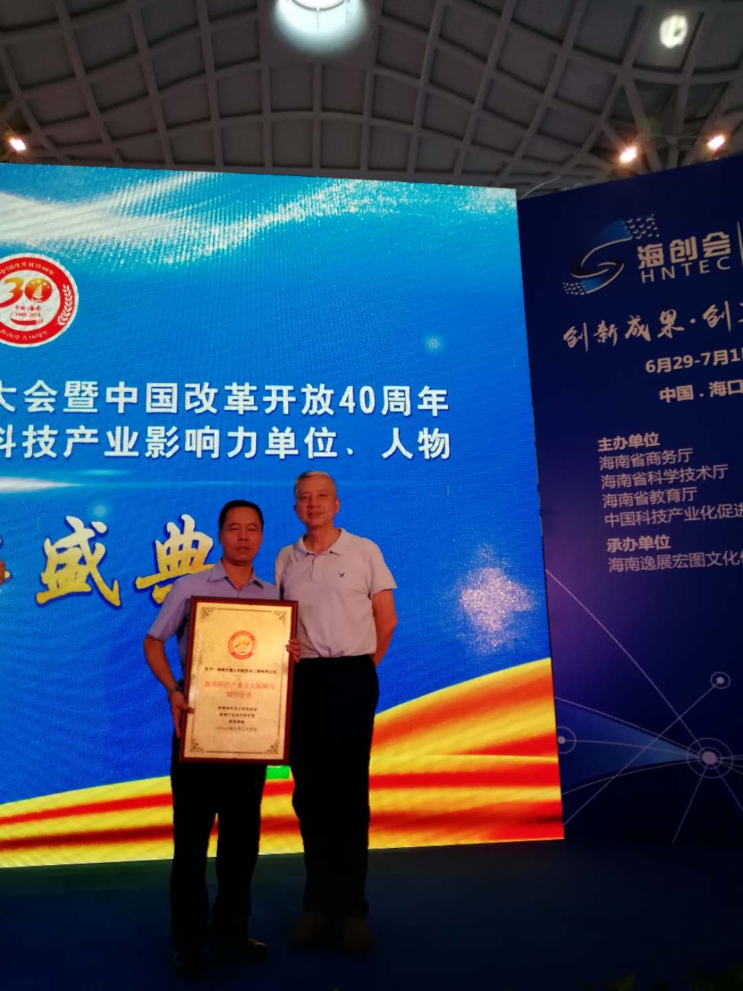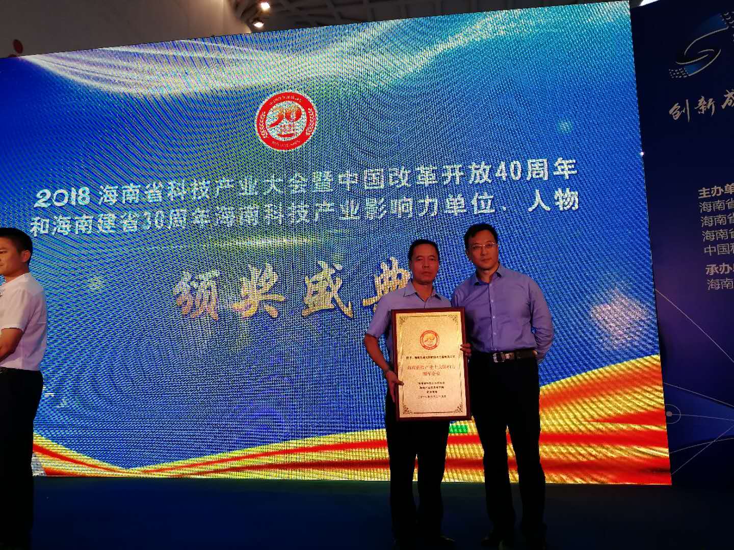 2018年6月(yue)29日,我司(si)在海(hai)南省科技產(chan)(chan)業(ye)大(da)會暨中國改革開(kai)發10周(zhou)年和海(hai)南建省30周(zhou)年科技產(chan)(chan)業(ye)影響力(li)大(da)會上獲得《海(hai)南科技產(chan)(chan)業(ye)十(shi)大(da)影響力(li)領軍企業(ye)》榮譽,公(gong)司(si)董事長寧家川與新(xin)浪海(hai)南總經(jing)理馮林輝先(xian)生,海(hai)南南海(hai)經(jing)濟(ji)技術研究院(yuan)院(yuan)長胡(hu)衛東先(xian)生,中科院(yuan)西(xi)安光機所研究員張國琦(qi)先(xian)生合影。