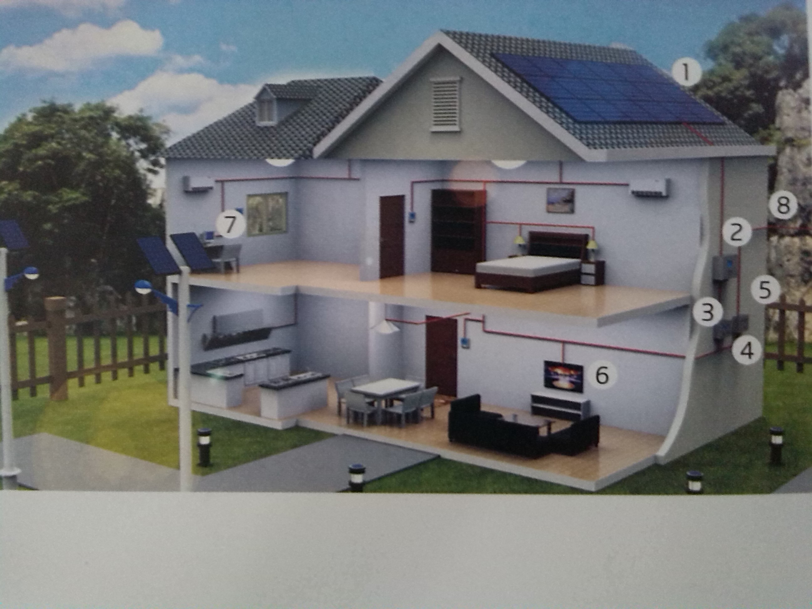 ①光(guang)(guang)伏(fu)陣列②光(guang)(guang)伏(fu)逆變起③計量電(dian)(dian)表④交流接線(xian)盒⑤智能電(dian)(dian)表⑥家庭負載⑦系統監控(kong)⑧電(dian)(dian)網