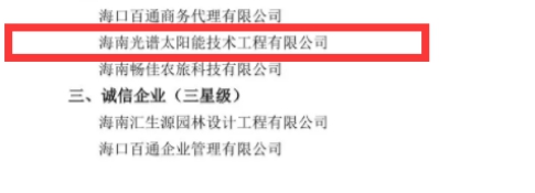 2020年6月(yue)11日,海南光譜太陽能技術工程有限(xian)公司,榮獲海南省“四星級誠信先進企業”榮譽稱號。